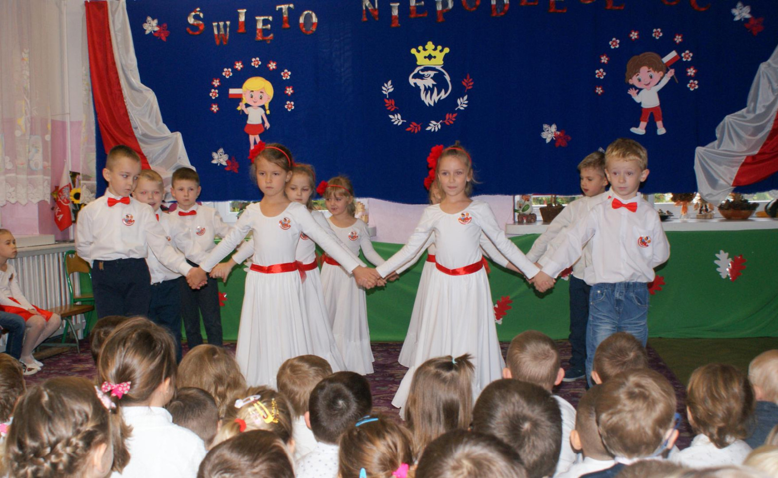 W Gminnym Przedszkolu w Makowie również uroczyście obchodzono Narodowe Święto Niepodległości. Z tej okazji wszystkie dzieci uroczyście świętowały ten wyjątkowy dla Nas – Polaków dzień. Głównym celem spotkania było kształtowanie miłości i przywiązania do kraju ojczystego, jego kultury i tradycji oraz poznanie symboli narodowych naszego kraju. Dzieci z wszystkich grup z dumą prezentowały przypięte biało – czerwone kotyliony. Część artystyczna była poprzedzona odśpiewaniem hymnu państwowego. Dzieci 6-5 letnie z grupy „Tygryski” przygotowane przez Panią Annę zaprezentowały uroczystą inscenizację z okazji Święta naszej Ojczyzny. Słowem, tańcem i piosenką oddały szacunek symbolom narodowym, symbolom walki o wolność i zwycięstwo oraz miłość do Ojczyzny.