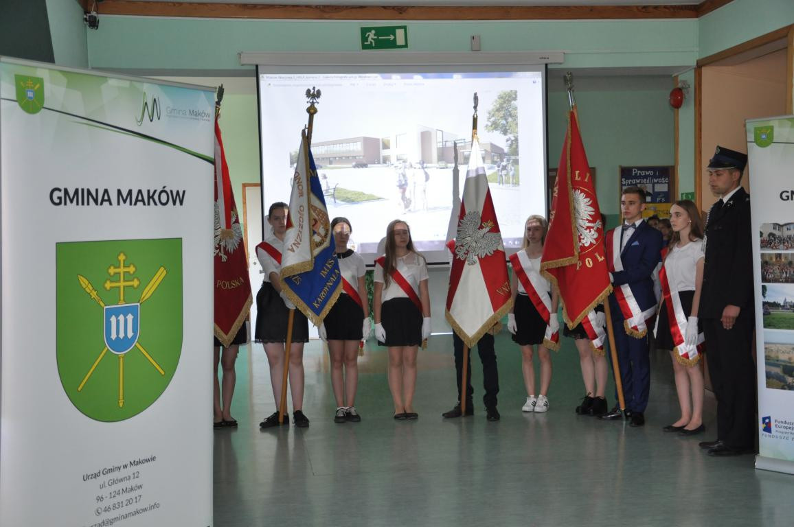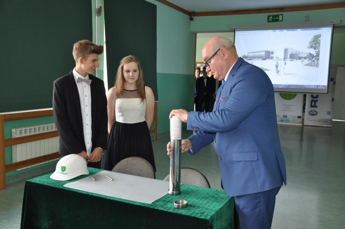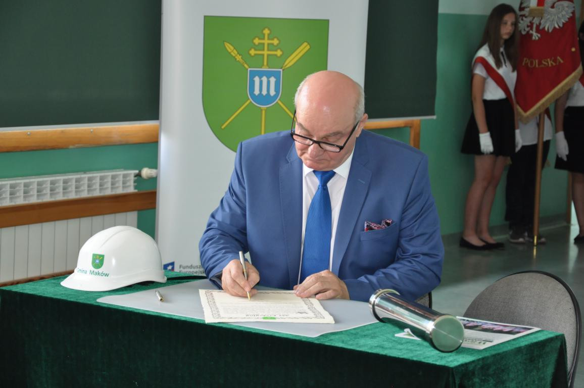 W czwartek, 21 czerwca 2018 r. odbyło się uroczyste podpisanie aktu erekcyjnego wraz z wmurowaniem kamienia węgielnego pod budowę Hali Sportowej w Makowie. Na wstępie uroczystości, wprowadzono sztandary szkół z terenu Gminy Maków oraz odśpiewano hymn państwowy. Po powitaniu zaproszonych gości, społeczności szkolnej oraz mieszkańców gminy przez Pana Wójta Jerzego Stankiewicza, przystąpiono do właściwej części ceremonii. Pani Aneta Kowalczyk – prowadząca uroczystość odczytała treść Aktu Erekcyjnego. Następnie Wójt Gminy, zaproszeni goście oraz przedstawiciele środowisk szkolnych dokonali uroczystego podpisania Aktu Erekcyjnego, który został zamknięty w stalowej tubie wraz z ostatnim numerem gazety Wieści z Gminy.