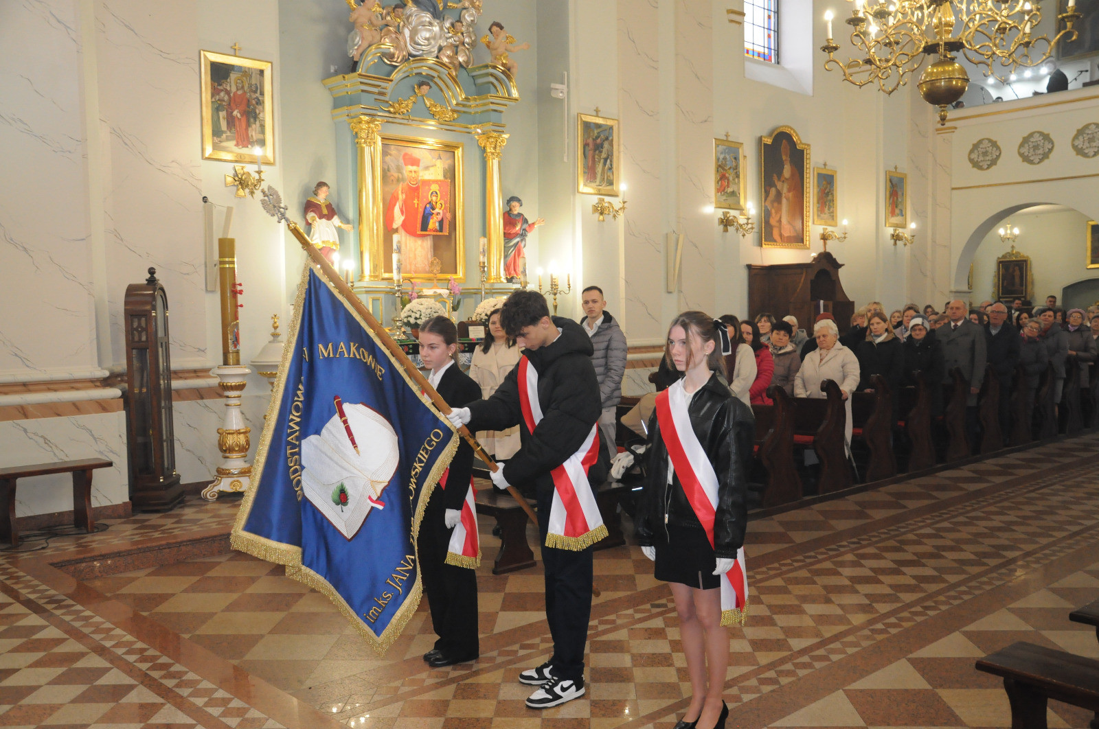 Tradycyjnie już, w dniu 11 listopada uczciliśmy w naszej Gminie rocznicę odzyskania Niepodległości. Z tej okazji w makowskim kościele pw. Św. Wojciecha odprawiona została uroczysta Msza Św. w intencji Ojczyzny, którą celebrował wikariusz parafii ks. Patryk Cieślak. We Mszy Św. uczestniczyły m.in. władze Gminy Maków: Wójt Gminy Jerzy Stankiewicz, Zastępca Wójta Emilia Smolarek, radni Rady Gminy, dyrektorzy i nauczyciele oraz poczty sztandarowe ze szkół i jednostek ochotniczych straży pożarnych z terenu Gminy, a także liczna grupa naszych mieszkańców. Oprawę muzyczną uroczystości zapewniła makowska Orkiestra Dęta OSP pod dyrekcją dh Mariana Chmielewskiego. Uroczystość rozpoczęła się wspólnym odśpiewaniem Hymnu Polski przez wszystkich obecnych, a na zakończenie uroczystości orkiestra wykonała wiązankę pieśni patriotycznych.