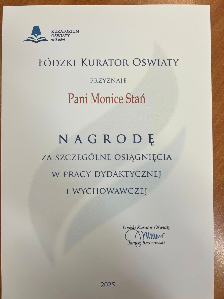 Ponadto, nagrodę Łódzkiego Kuratora Oświaty otrzymała Pani Monika Stań, która w sposób szczególny zasłużyła się w pracy pedagogicznej, realizując liczne inicjatywy edukacyjne, wychowawcze i społeczne, a także wspierając rozwój uczniów zgodnie z ideą nowoczesnej szkoły.
