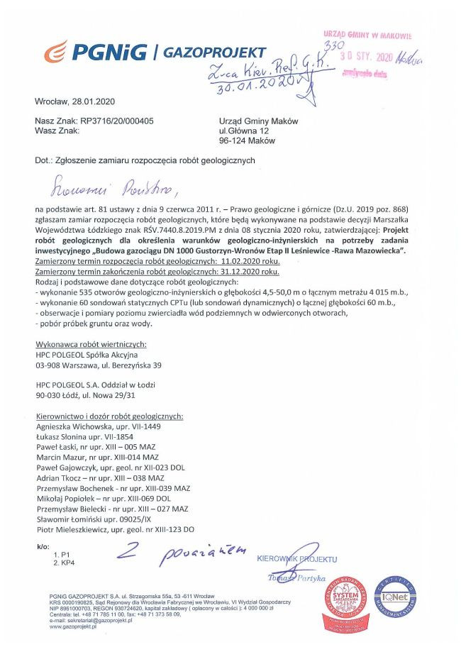 Urząd Gminy w Makowie inforuje, że od 11.02.2020r. do 31.12.2020r. na terenie Gminy Maków planowane jest wykonanie 535 otworów geologiczno inżynierskich o głębokości 4,5-50,0 m o łącznym metrażu 4 015 m.b, oraz wykonanie 60 sondowań statycznych VPTu p łącznej głębokości 60 m.b. Zostaną rówieniż wykonane obserwacje i pomiary poziomu zwierciadła wód podziemnych w odwierconych otworach, oraz pobór próbek gruntu oraz wody.