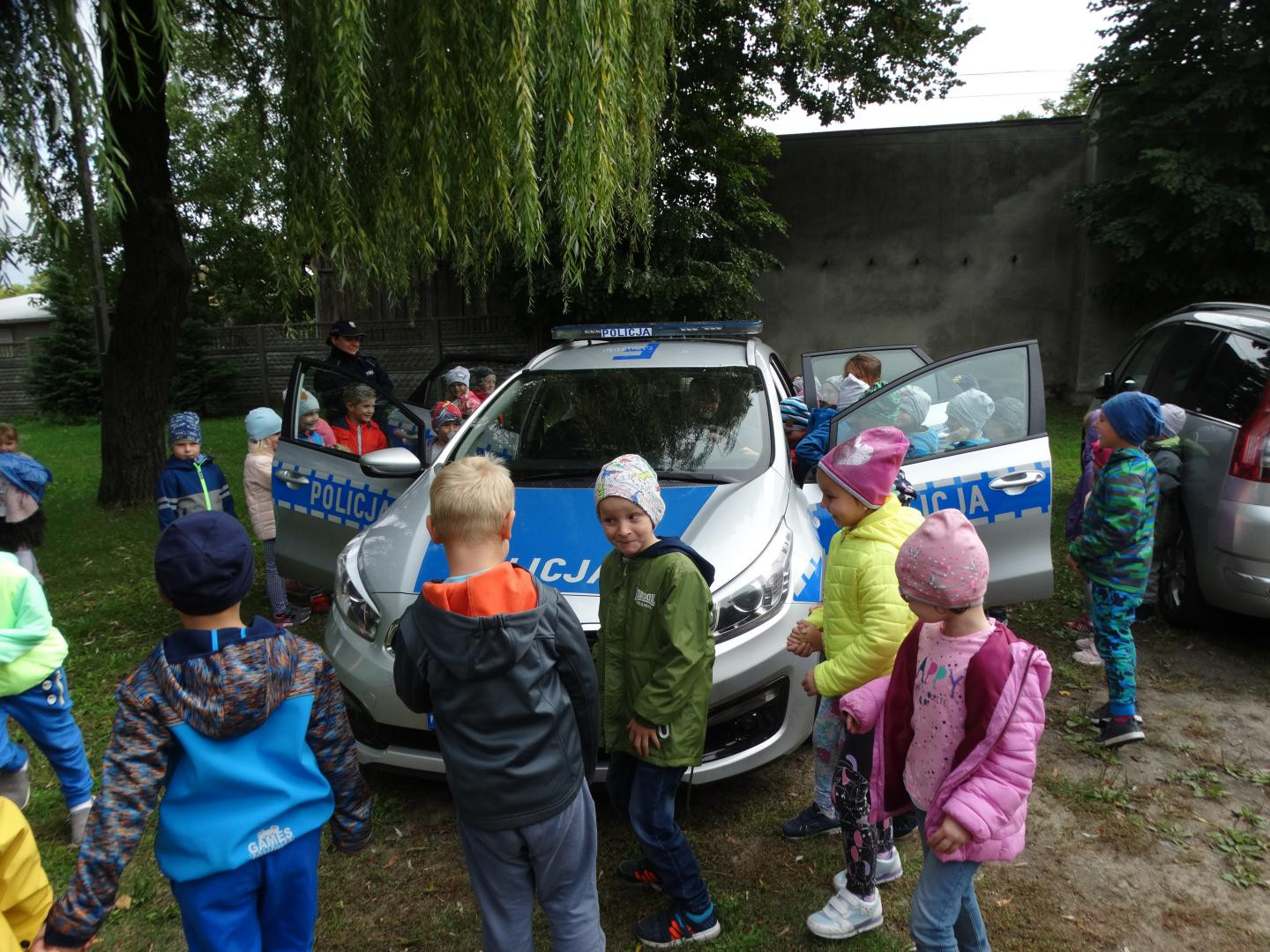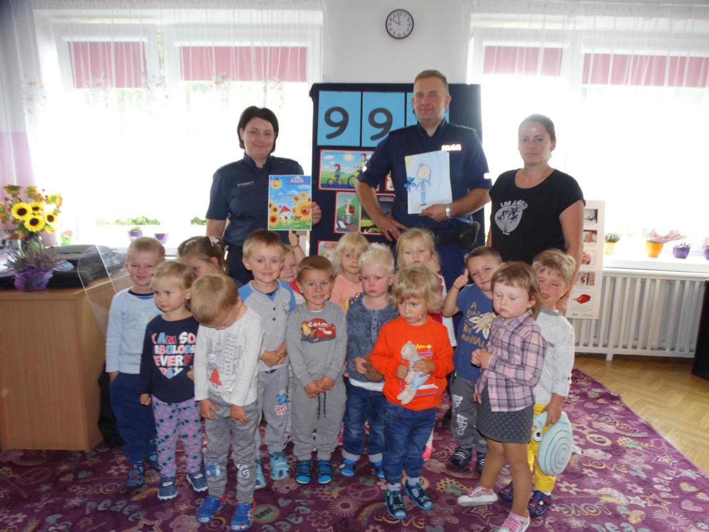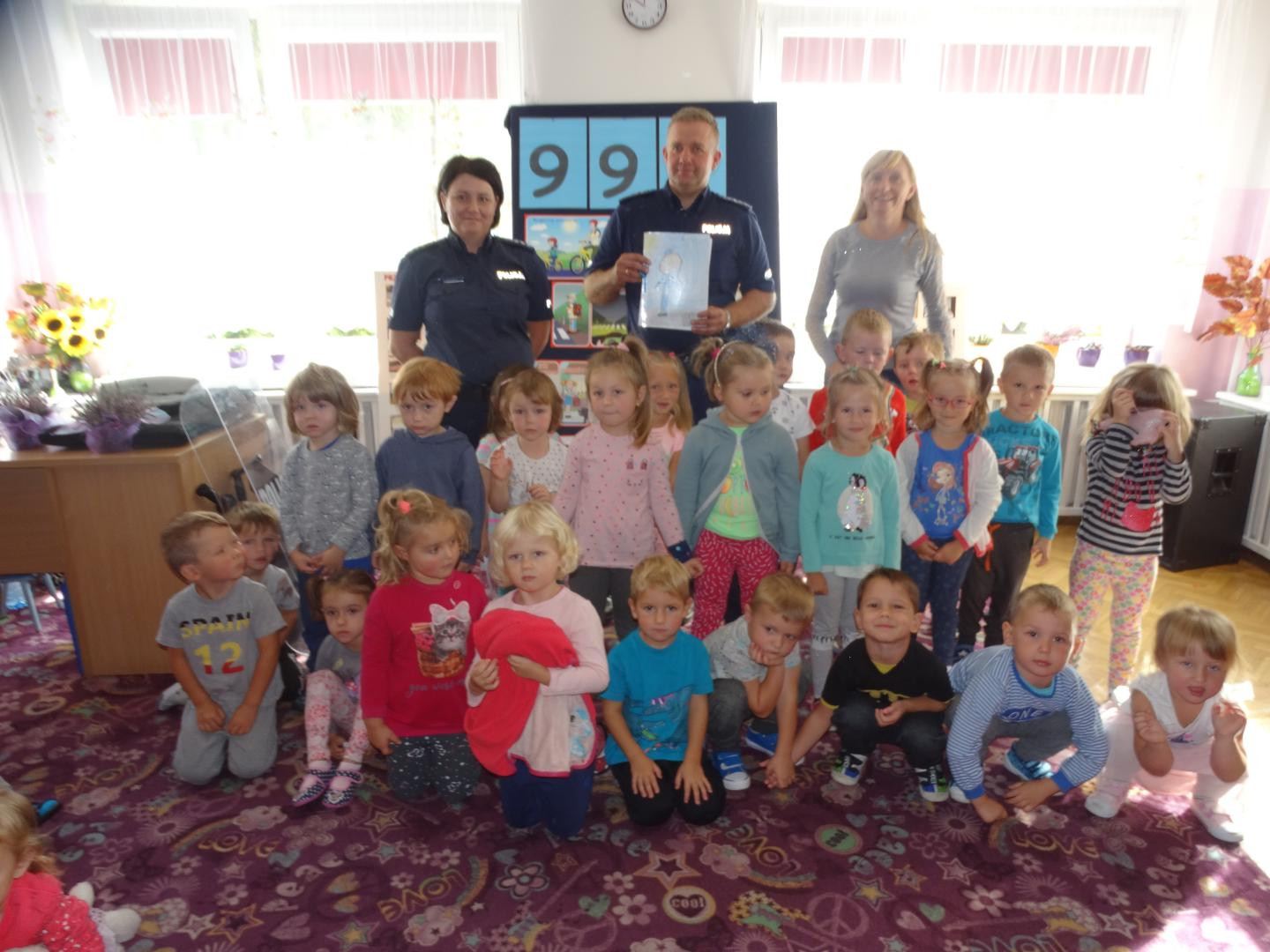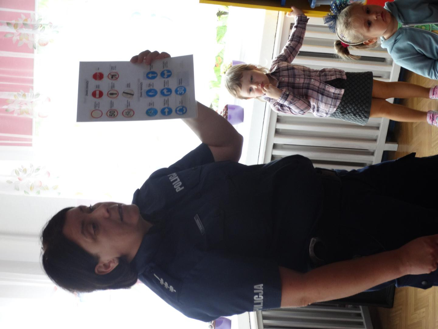 Dnia 19 września gościliśmy w naszym przedszkolu funkcjonariuszy policji z Komendy Miejskiej Policji w Skierniewicach. Tematem spotkania było utrwalenie z dziećmi zasad ruchu drogowego oraz przypomnienie zagadnień dotyczących bezpieczeństwa dzieci w przedszkolu i w domu. Policjanci w formie praktycznej, przypomnieli dzieciom podstawowe zasady zachowania się podczas przechodzenia przez jezdnię. Następnie wytłumaczyli jak należy zachować się w kontaktach z obcymi ludźmi, jak dbać o bezpieczeństwo własne i innych oraz do kogo zwracać się o pomoc w sytuacji zagrożenia. Pani policjantka zademonstrowała dzieciom w jaki sposób należy się zachowywać podczas ataku psa. Dzieci z dużym zainteresowaniem słuchały rad i wskazówek zaproszonych gości. Na zakończenie wizyty przedszkolaki miały okazję zobaczyć radiowóz policyjny i przez chwilę poczuć się jak prawdziwy policjant.
