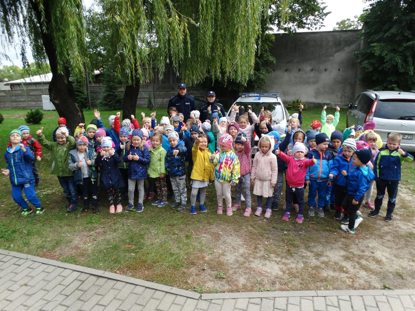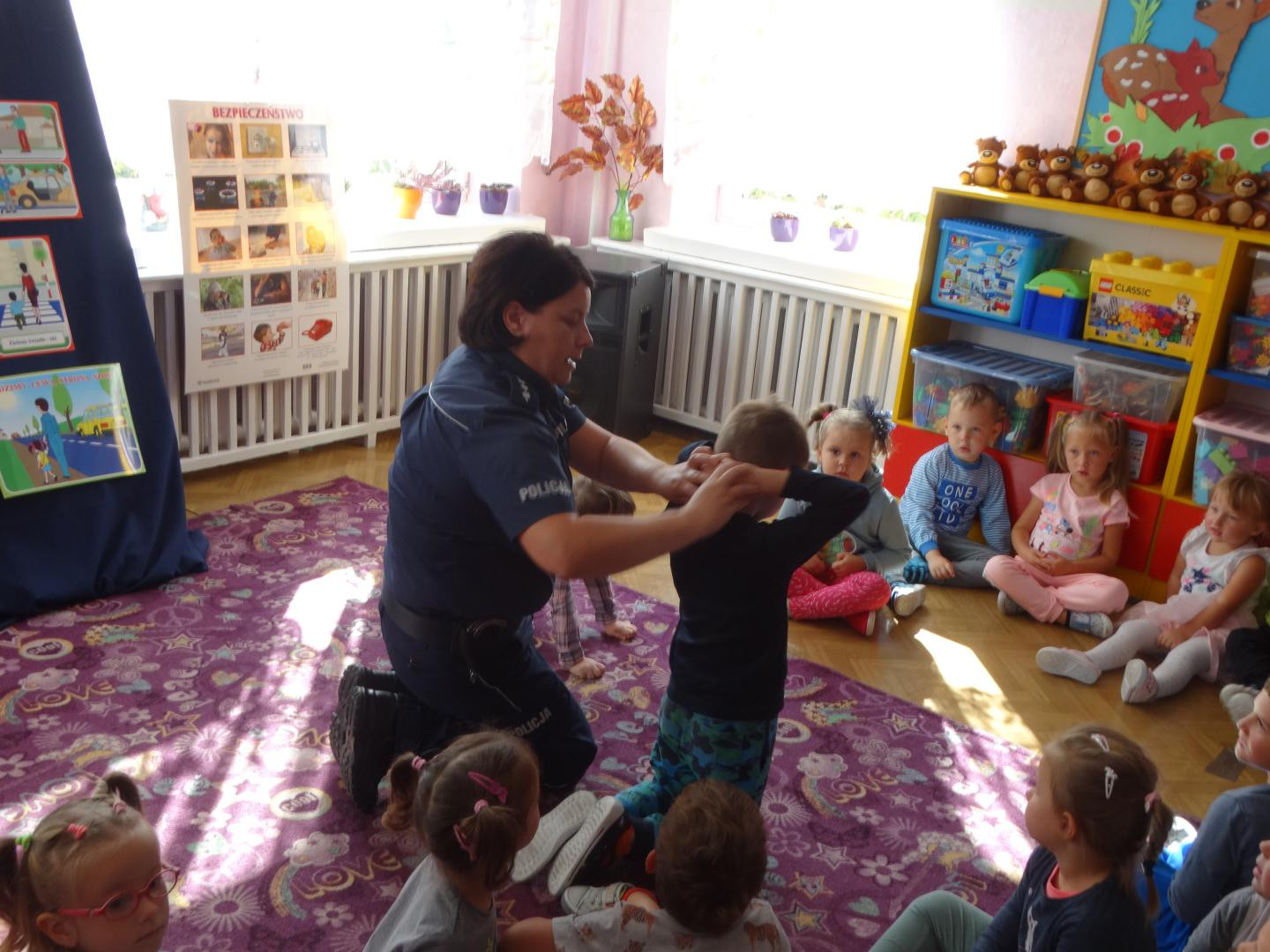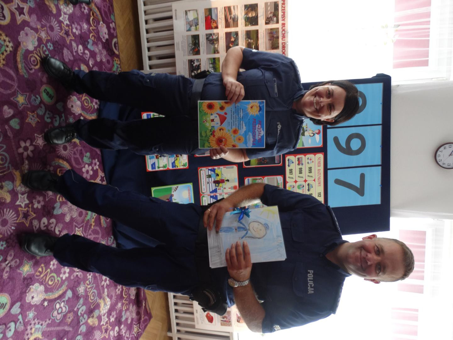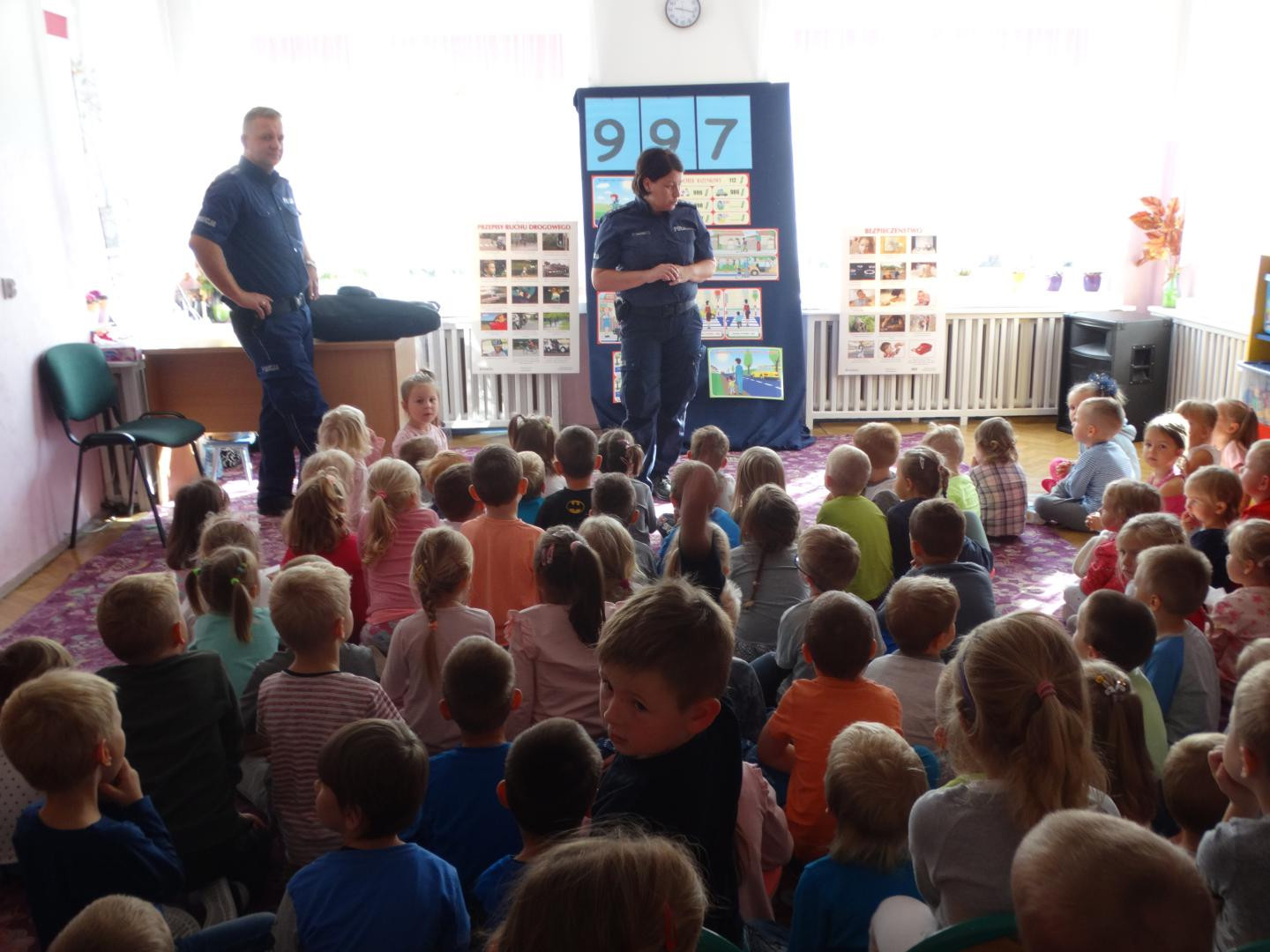 Dnia 19 września gościliśmy w naszym przedszkolu funkcjonariuszy policji z Komendy Miejskiej Policji w Skierniewicach. Tematem spotkania było utrwalenie z dziećmi zasad ruchu drogowego oraz przypomnienie zagadnień dotyczących bezpieczeństwa dzieci w przedszkolu i w domu. Policjanci w formie praktycznej, przypomnieli dzieciom podstawowe zasady zachowania się podczas przechodzenia przez jezdnię. Następnie wytłumaczyli jak należy zachować się w kontaktach z obcymi ludźmi, jak dbać o bezpieczeństwo własne i innych oraz do kogo zwracać się o pomoc w sytuacji zagrożenia. Pani policjantka zademonstrowała dzieciom w jaki sposób należy się zachowywać podczas ataku psa. Dzieci z dużym zainteresowaniem słuchały rad i wskazówek zaproszonych gości. Na zakończenie wizyty przedszkolaki miały okazję zobaczyć radiowóz policyjny i przez chwilę poczuć się jak prawdziwy policjant.