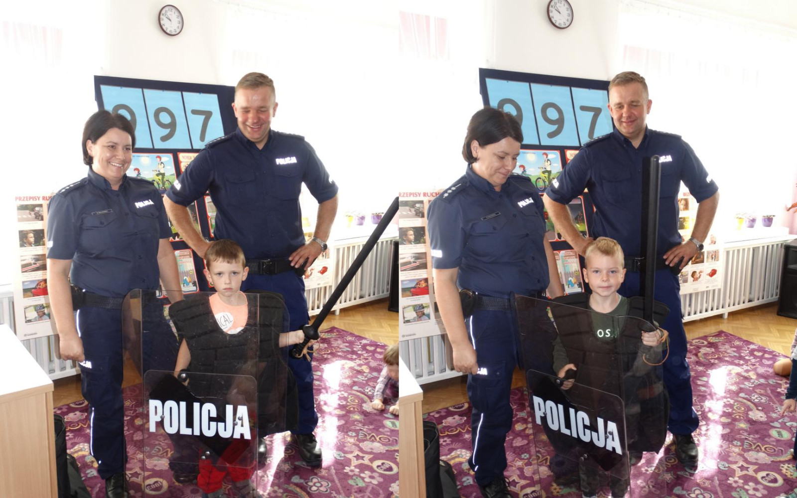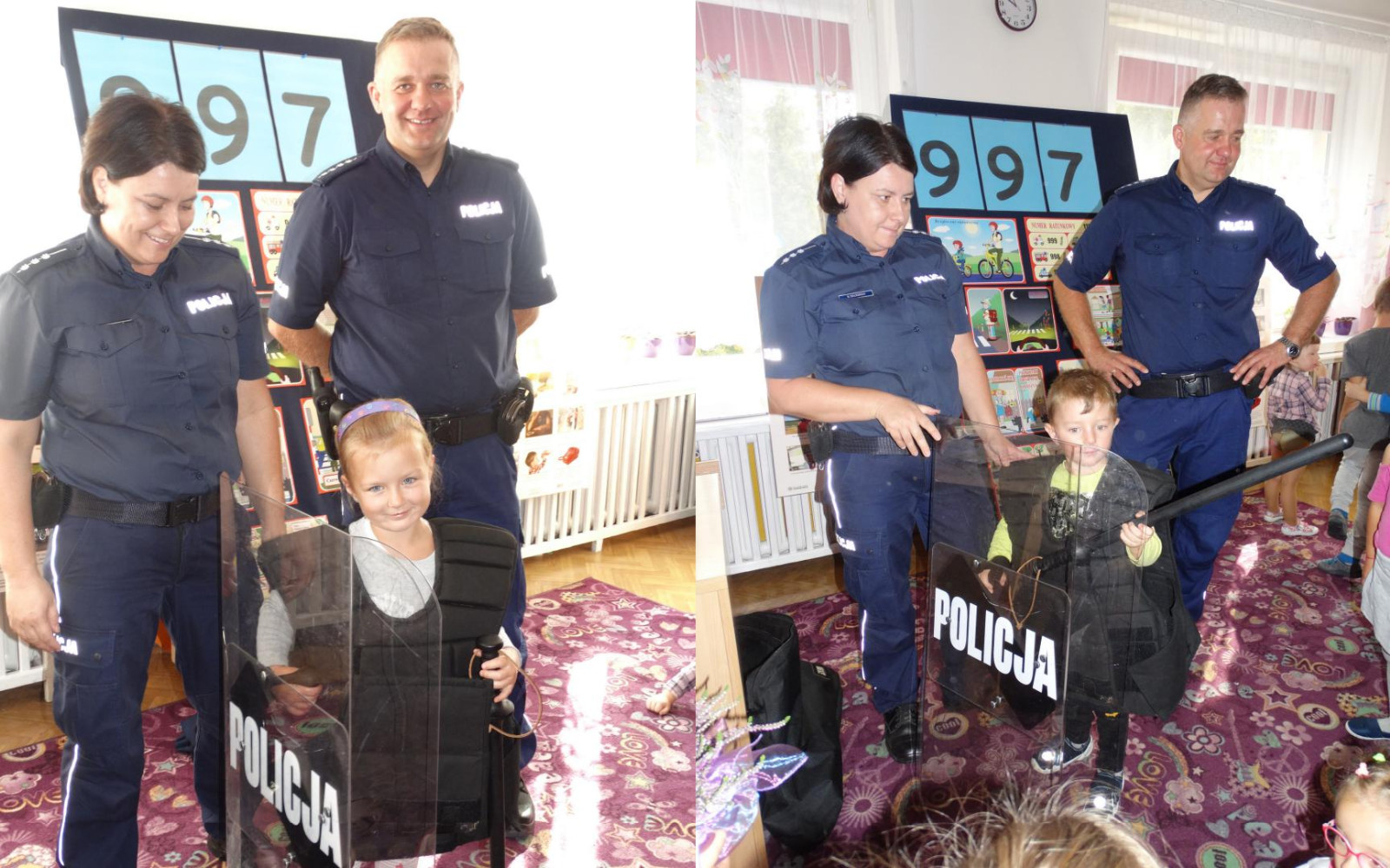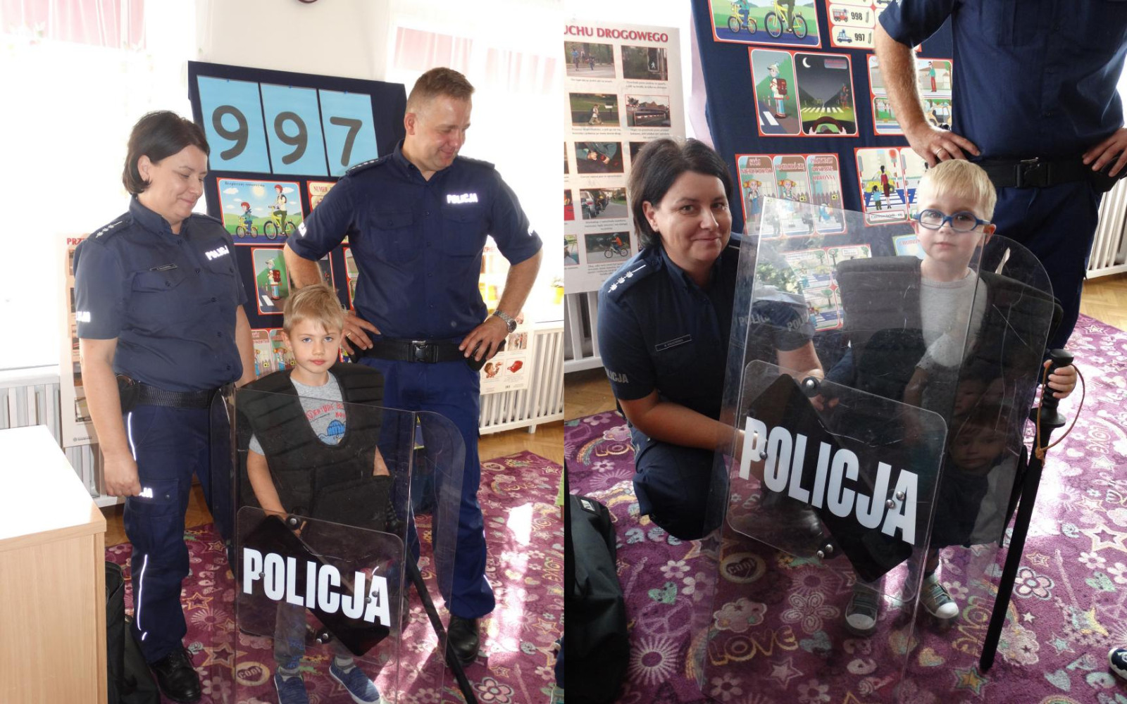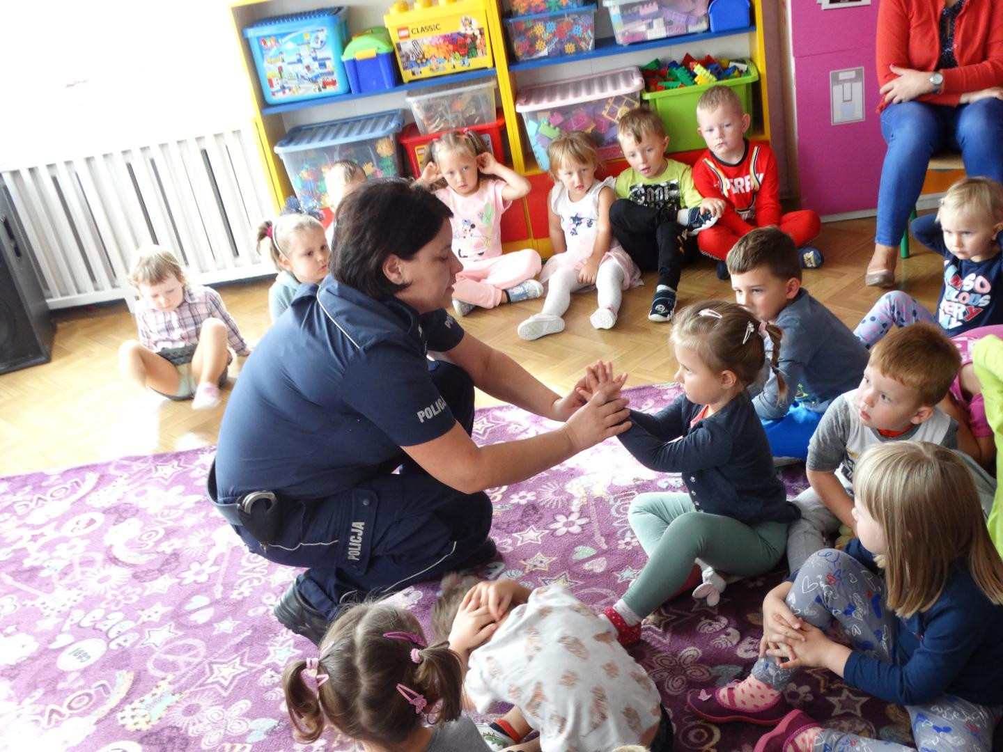 Dnia 19 września gościliśmy w naszym przedszkolu funkcjonariuszy policji z Komendy Miejskiej Policji w Skierniewicach. Tematem spotkania było utrwalenie z dziećmi zasad ruchu drogowego oraz przypomnienie zagadnień dotyczących bezpieczeństwa dzieci w przedszkolu i w domu. Policjanci w formie praktycznej, przypomnieli dzieciom podstawowe zasady zachowania się podczas przechodzenia przez jezdnię. Następnie wytłumaczyli jak należy zachować się w kontaktach z obcymi ludźmi, jak dbać o bezpieczeństwo własne i innych oraz do kogo zwracać się o pomoc w sytuacji zagrożenia. Pani policjantka zademonstrowała dzieciom w jaki sposób należy się zachowywać podczas ataku psa. Dzieci z dużym zainteresowaniem słuchały rad i wskazówek zaproszonych gości. Na zakończenie wizyty przedszkolaki miały okazję zobaczyć radiowóz policyjny i przez chwilę poczuć się jak prawdziwy policjant.