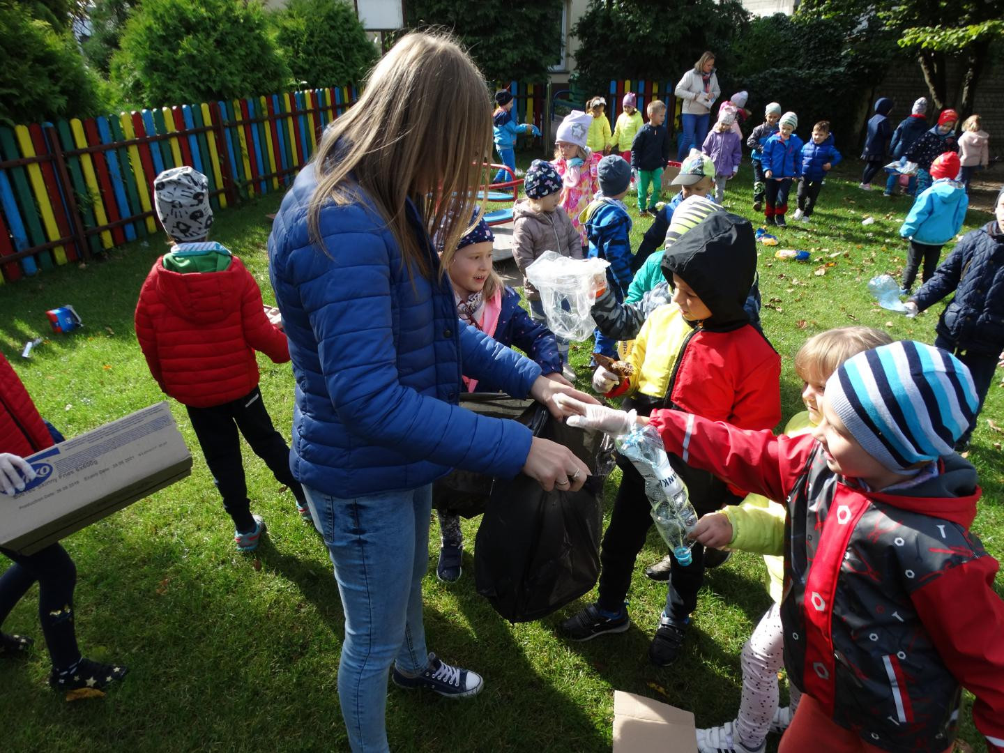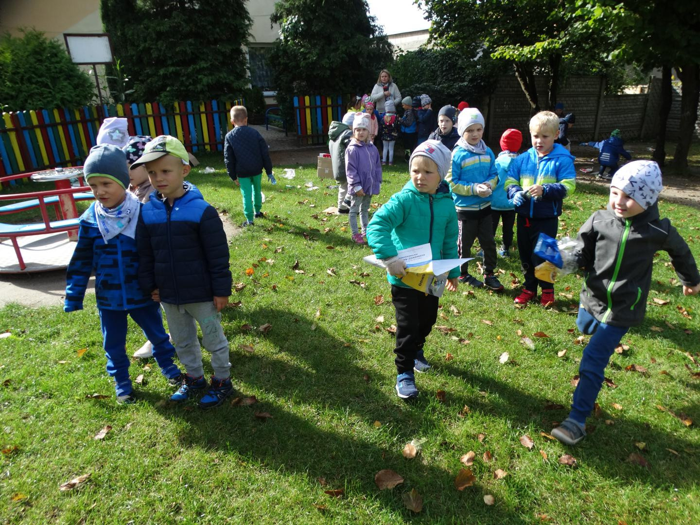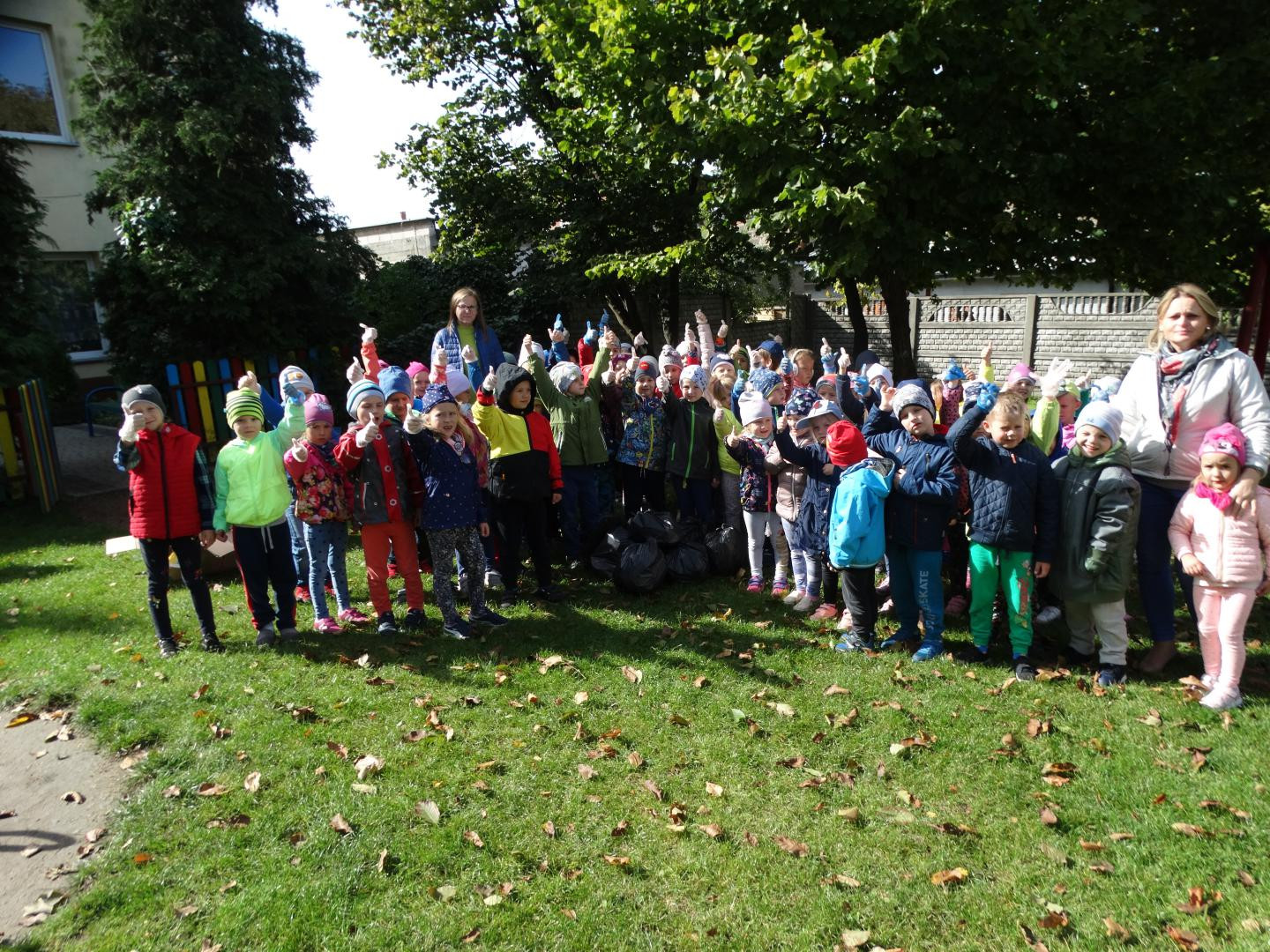 Tradycyjnie, jak co roku, we wrześniu nasze przedszkole włącza się do ogólnopolskiej akcji „Sprzątanie Świata”, by od najmłodszych lat uczyć dzieci zasad dbania o środowisko naturalne. Tegoroczna edycja odbyła się pod hasłem „Nie śmiecimy! – Sprzątamy! – Zmieniamy!”. Po krótkiej pogadance na temat konieczności ochrony środowiska, dzieci zaopatrzone w rękawiczki i worki, z wiedzą czego szukamy i co zbieramy, rozpoczęły porządkowanie terenu wokół przedszkola oraz placu zabaw. Maluchy z ogromnym zaangażowaniem przystąpiły do pracy i dzielnie zbierały papierki, folie, kartony i butelki po napojach, odpowiednio je segregując. Efektem działań było uzbieranie dwunastu worków śmieci. Przedszkolaki, widząc jak dużo jest śmieci wokół i jak trudno to posprzątać, nauczyły się, że czystość otoczenia, w którym przebywamy, zależy tylko od nas. Dla dzieci była to praktyczna nauka kształtowania postaw przyjaznych środowisku oraz racjonalnej gospodarki odpadami, poprzez selektywną zbiórkę i recykling. Mamy nadzieję, że zdobyte w ten sposób doświadczenia zaowocują w przyszłości dobrymi ekologicznymi nawykami.
