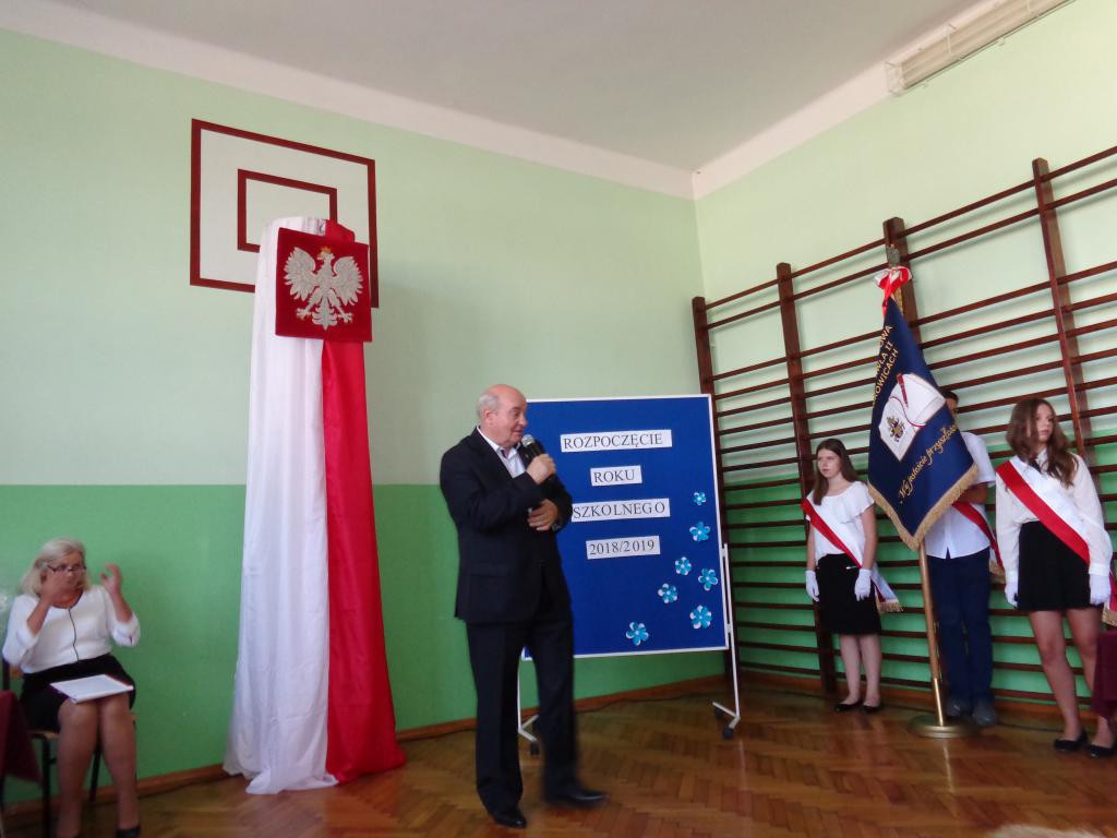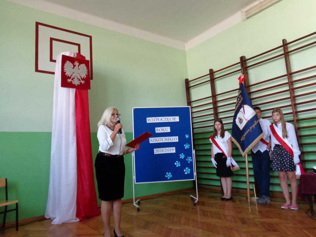 Po wprowadzeniu sztandaru szkoły, uczniowie wspólnie odśpiewali hymn państwowy. Dyrektor Szkoły Ewa Krawiec serdecznie powitała wszystkich zebranych. Przedstawiła nauczycieli i pracowników szkoły, a także przekazała informacje na temat prac remontowych i organizacji pracy szkoły w roku szkolnym 2018/2019. Następnie wszyscy obecni udali się na otwarcie nowego oddziału przedszkolnego, a uczniowie wraz ze swoimi wychowawcami do klas.