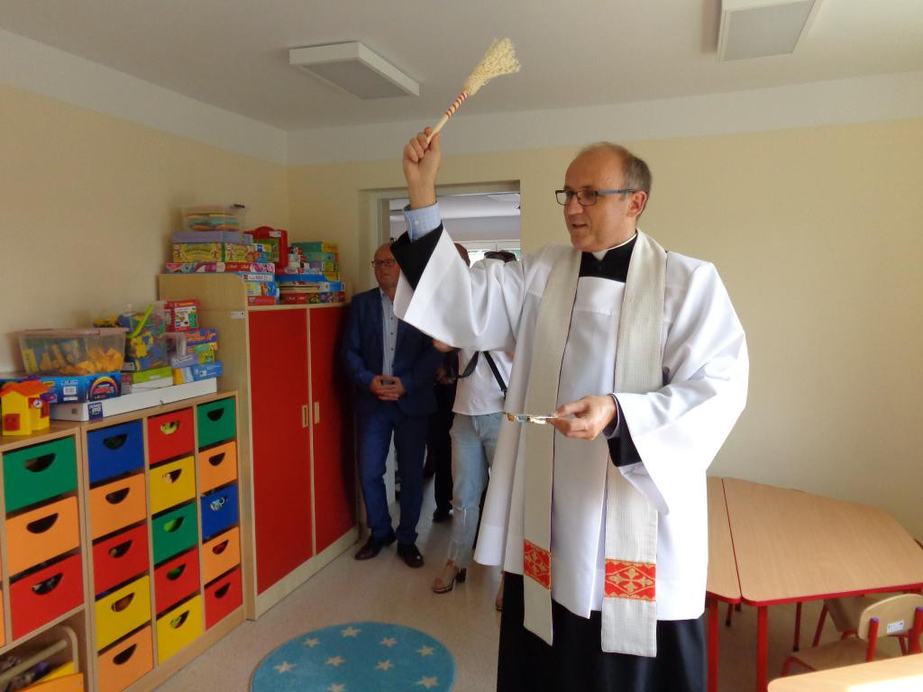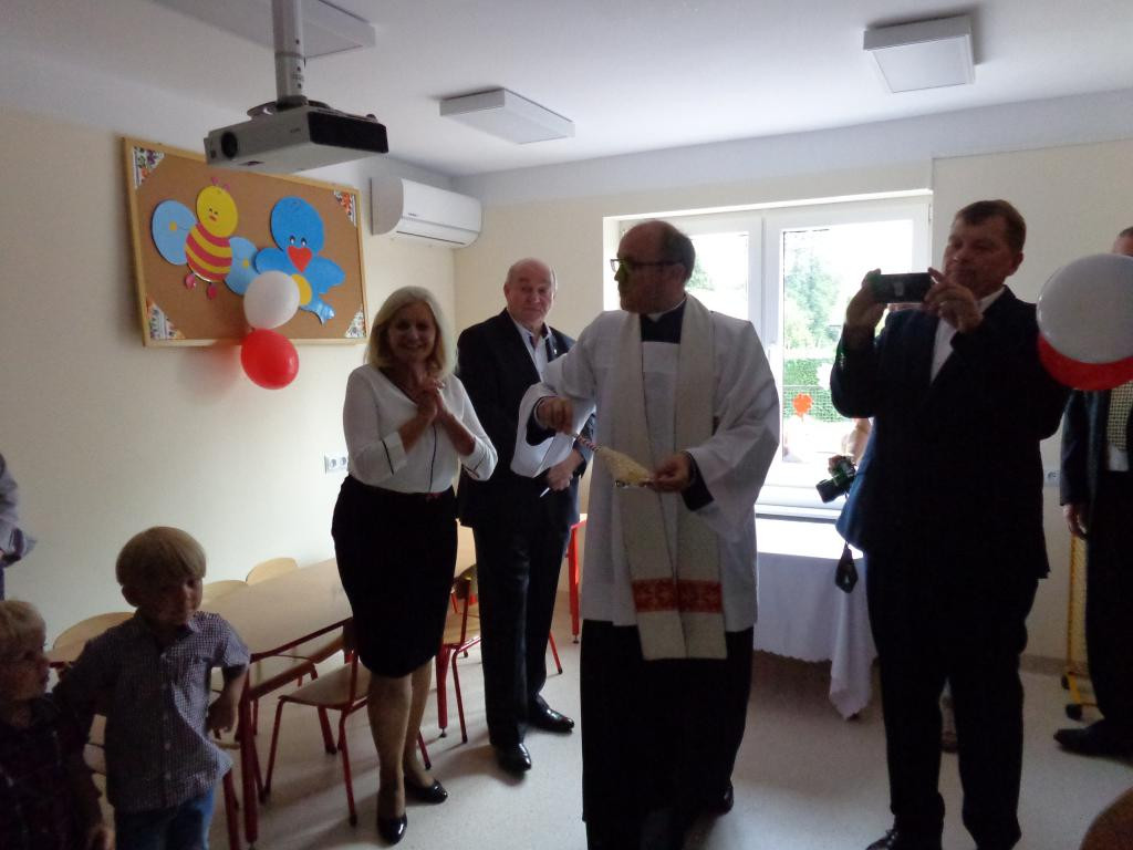Następnie ks. proboszcz Sławomir Wasilewski pobłogosławił i poświęcił pomieszczenia przedszkolne. Po oficjalnym otwarciu zaproszeni goście, w tym rodzice i dzieci, mieli możliwość zwiedzenia sal przedszkolnych. Uroczystość zakończono wspólnym posiłkiem na który zaproszono wszystkich gości.
