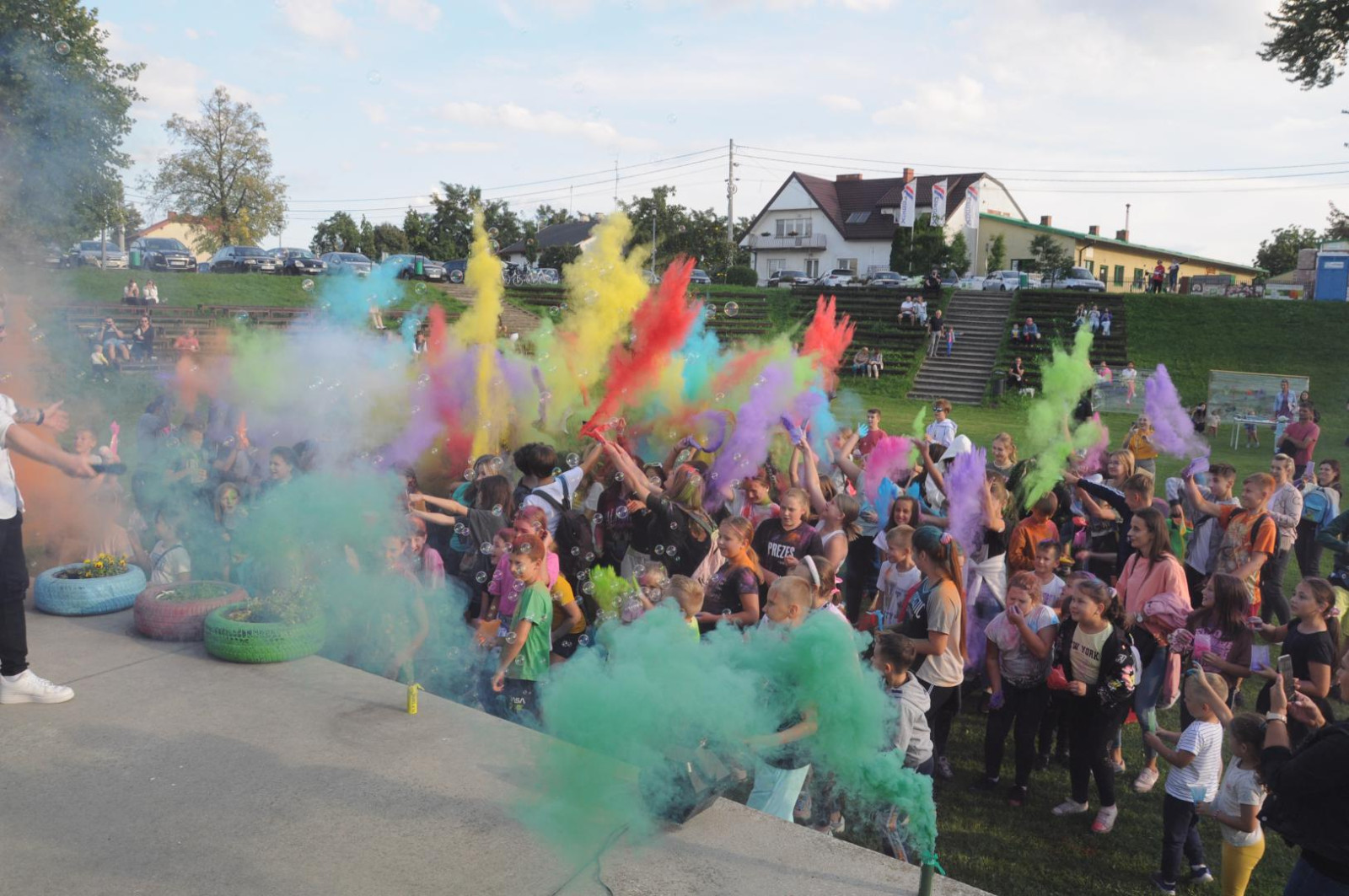 1 września br. w Makowskim Amfiteatrze odbył się kolejny Festiwal Kolorów. Uczestnicy Festiwalu, przy muzyce, obrzucali się kolorowymi proszkami „holi”. Wielobarwna chmura z wielu odcieni różu, fioletu, zieleni, żółci, ale też czerwieni i koloru niebieskiego, co 30 minut rozpościerała się nad uczestnikami festiwalu. Następnie, opadając kolorowała ich wszystkich, tworząc niesamowite i barwne kompozycje. Sądząc po nastrojach uczestników to wydarzenie sprawiało im ogromną frajdę i niesamowite przeżycia.Dzieci i młodzież mogły także bezpłatnie skorzystać z takich atrakcji jak mega gry planszowe, popcorn, wata cukrowa, tatuaże, malowanie twarzy, kolorowe warkoczyki, malowanie na foliach, mega bańki czy proszki holi. Cieszy nas bardzo fakt, że impreza z roku na rok przyciąga coraz więcej osób.