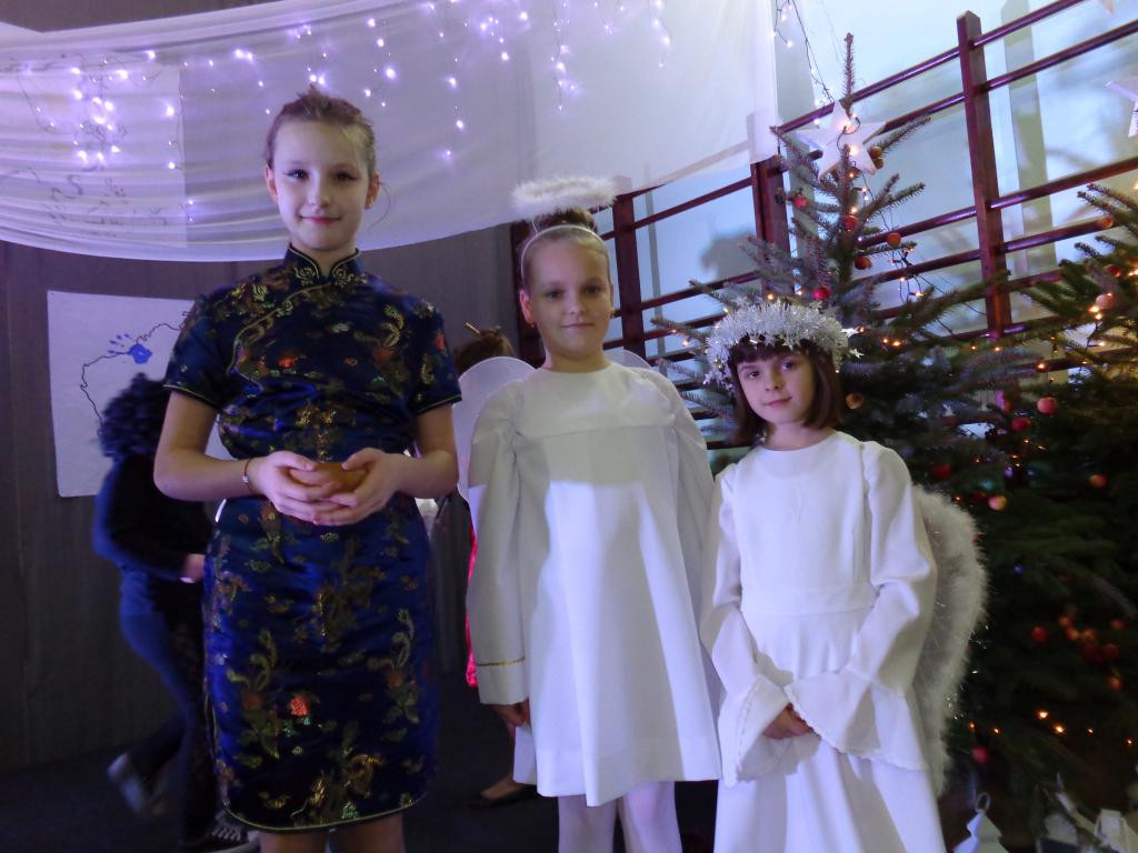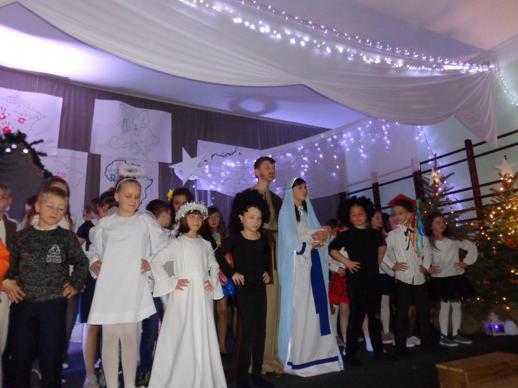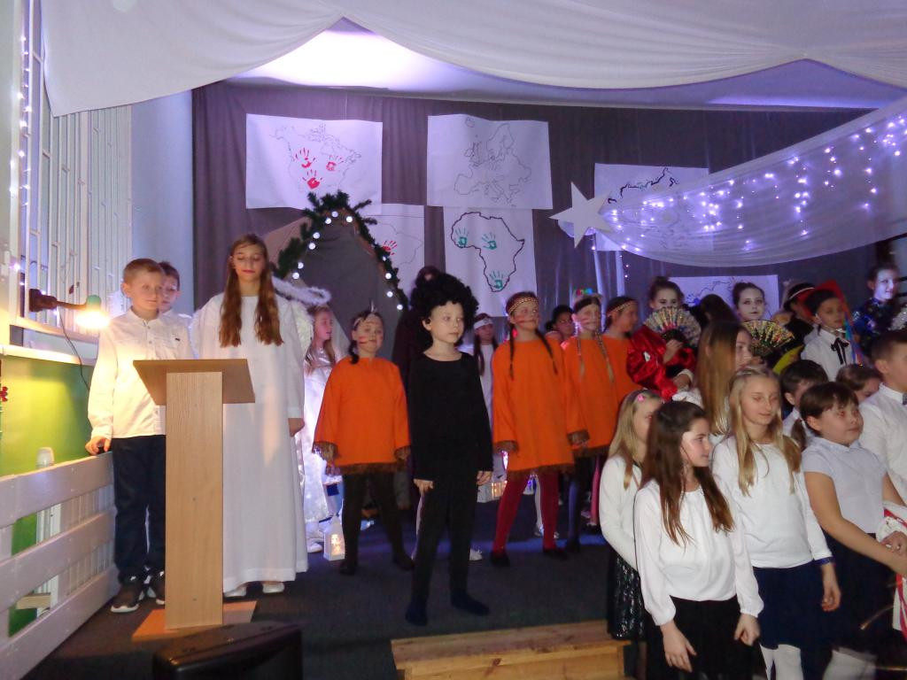 Na te kilka chwil sala zamieniła się w niebo rozgwieżdżone, a mali i więksi aktorzy przeprowadzili nas przez pięć kontynentów, byśmy mogli przekonać się na własne oczy, jak na narodziny Jezusa oczekują mieszkańcy każdego z nich. Usłyszeliśmy kolędę „Cicha noc” zaśpiewaną po ….. japońsku. Podziwialiśmy tańce afrykańskie, spotkaliśmy Hawajki, małych Indian, pasterzy z Europy. Na zakończenie uczniowie odtańczyli krakowiaka.